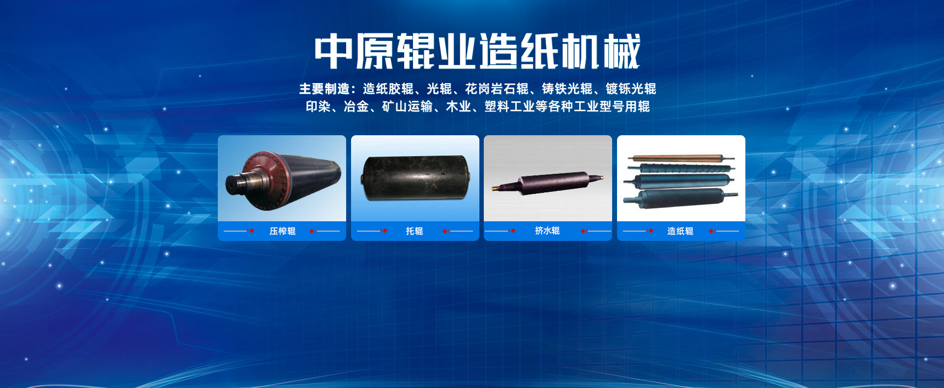 主要制造:造紙膠輥、光輥、花崗巖石輥、鑄鐵光輥、鍍鑠光輥、印染、冶金、礦山運(yùn)輸、木業(yè)、塑料工業(yè)等各種工業(yè)型號(hào)用輥